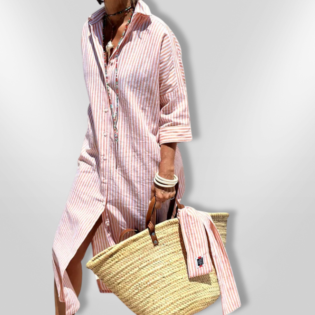 Das Greta gestreifte Hemdkleid kombiniert klassischen Stil mit modernem Komfort. Perfekt für den Frühling und Sommer, ist es die ideale Wahl für entspannte Tage und lässt sich sowohl für formelle als auch informelle Anlässe vielseitig kombinieren.