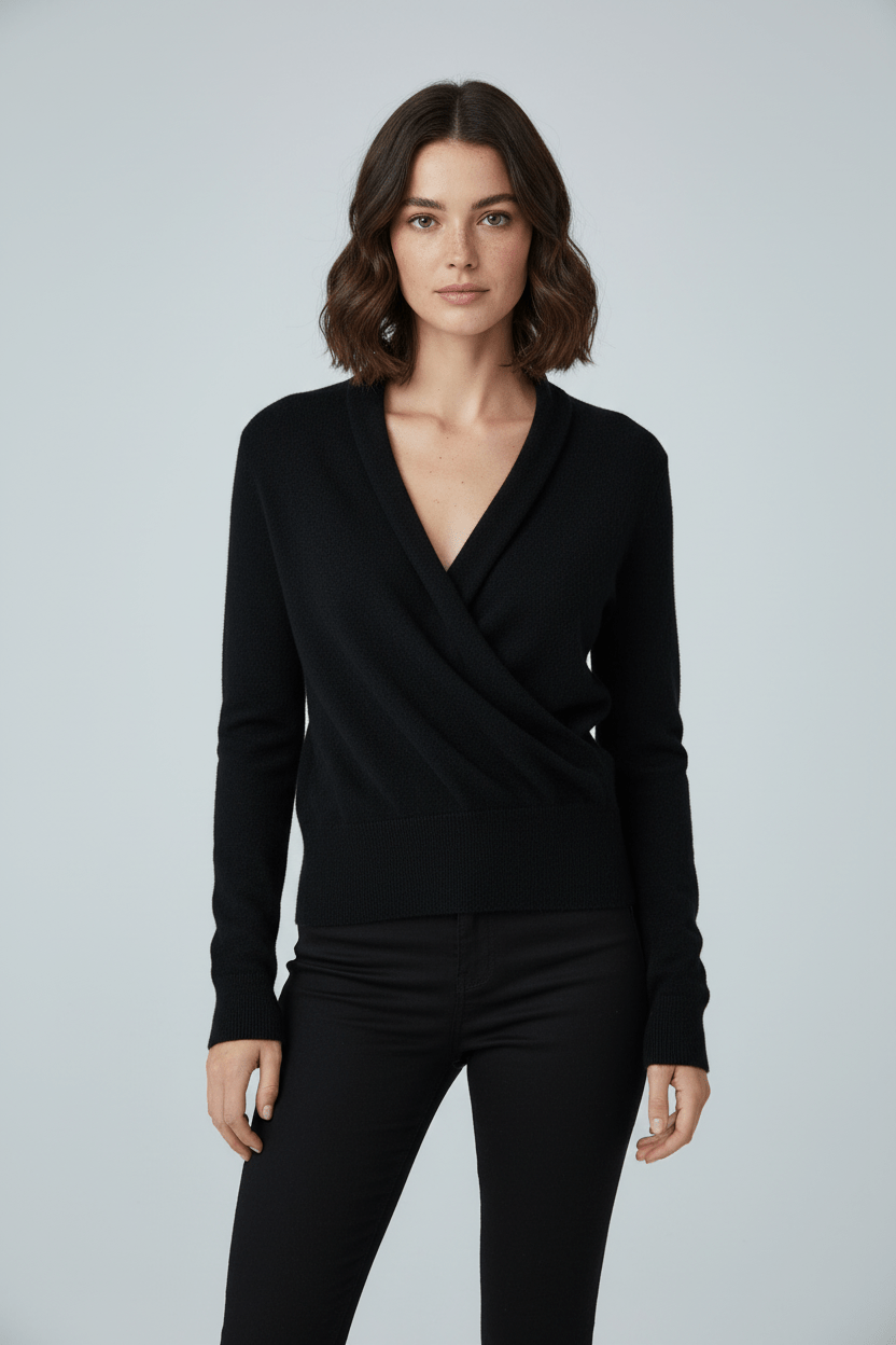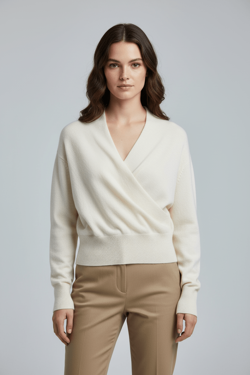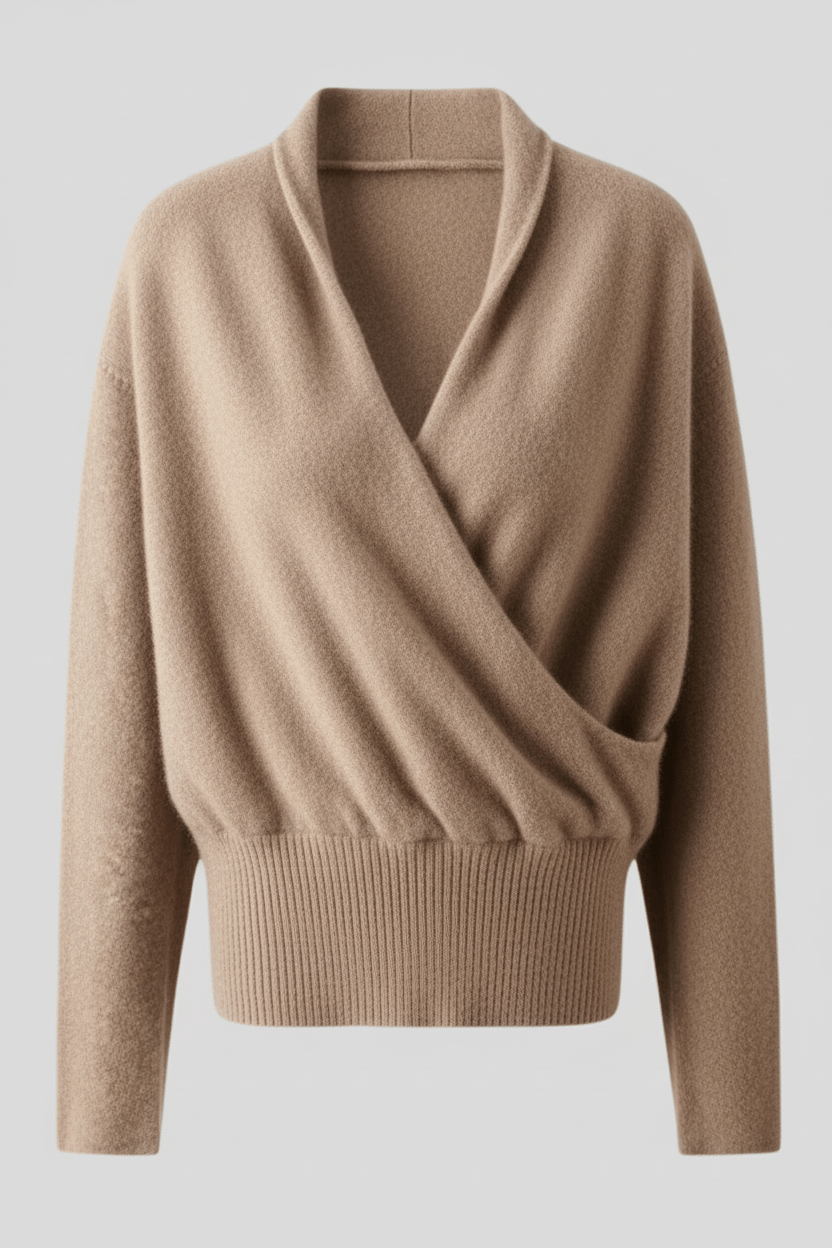 - Stilwörter: Damen-Wickelstrickpullover, Pullover mit gerippter Taille, Strickpullover mit entspannter Passform