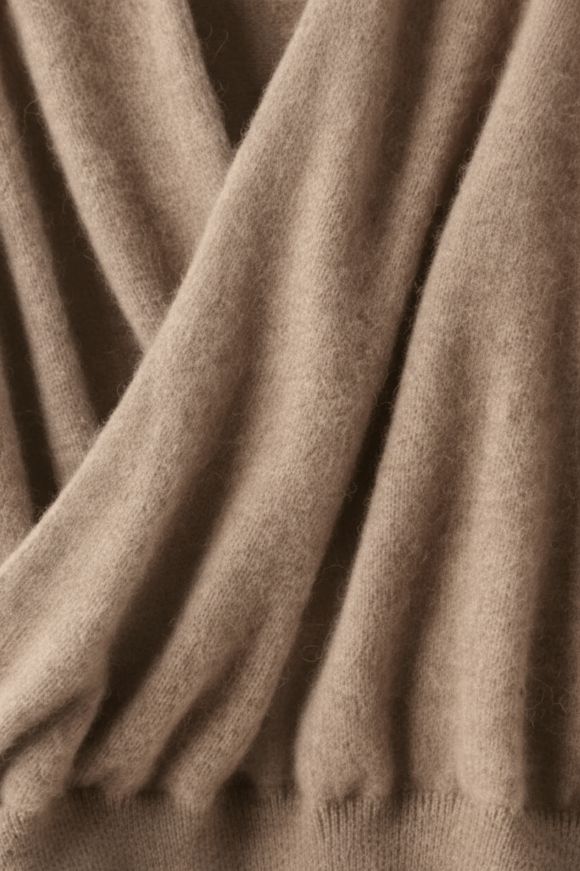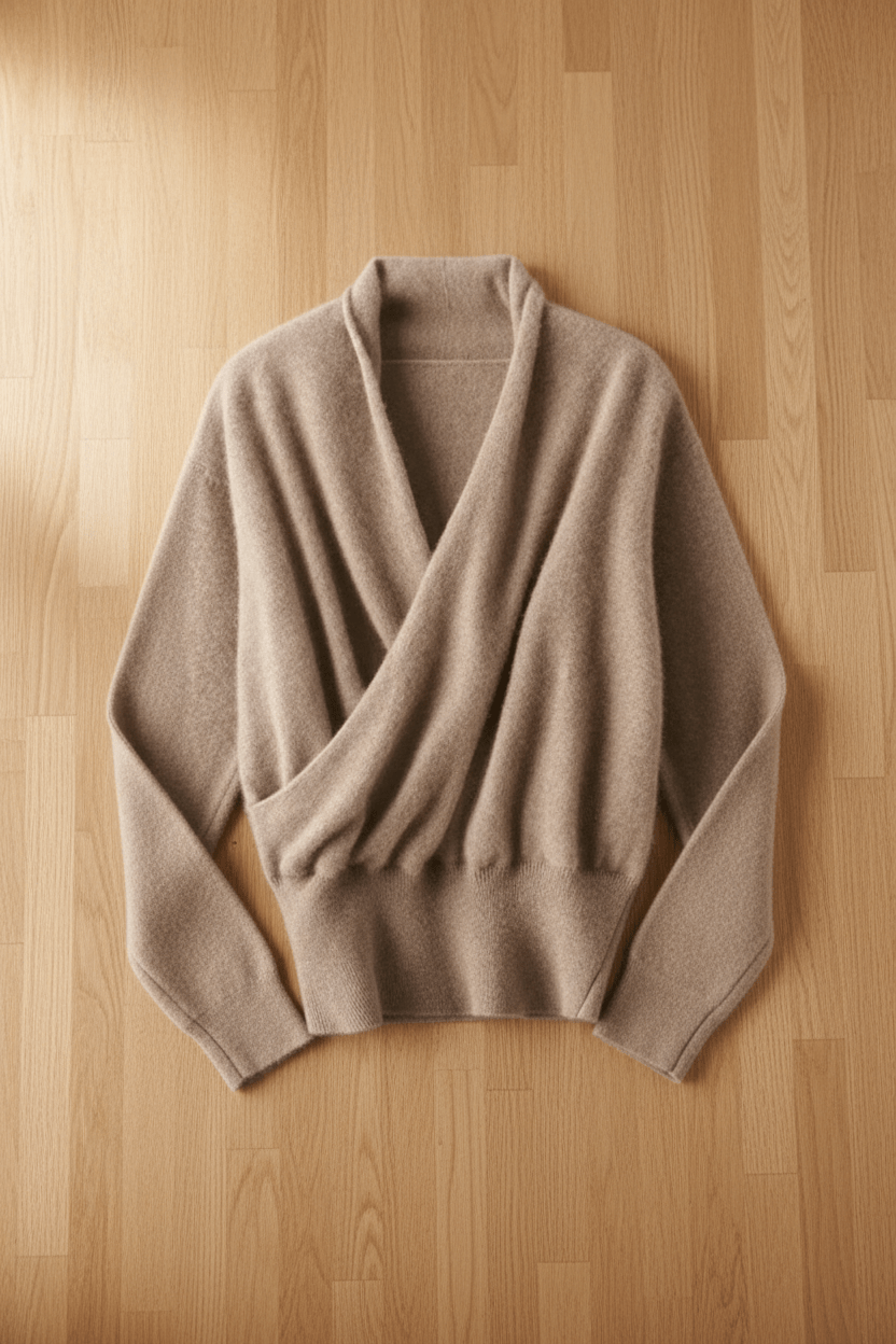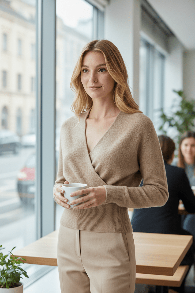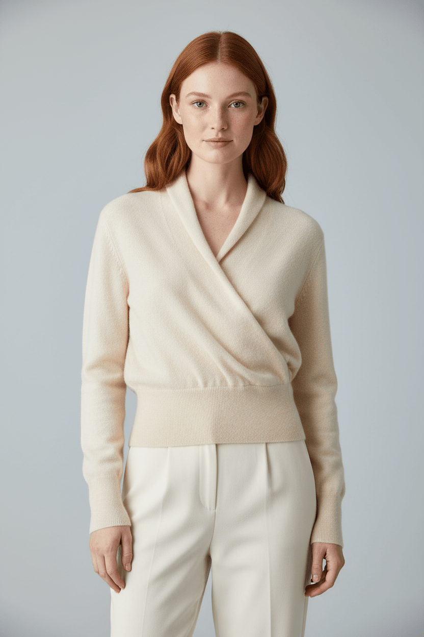 - Stilwörter: Damen-Wickelstrickpullover, Pullover mit gerippter Taille, Strickpullover mit entspannter Passform
